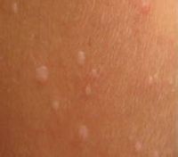 传染性软疣初起为米粒大、半球形丘疹,中心有小白点,逐渐增至如绿豆大,境界明显,质硬,中心凹陷似脐窝,呈灰白、乳白、微红或正常皮色,表面光滑。损害数目不定,少数散在,或数个簇集,不想融合,可挤出白色乳酪样物。
