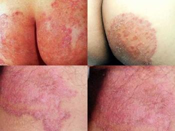 体癣在发病初期表现为米粒样的小红疙瘩,随着病情的发展逐渐向四周扩展,由密集的红色小疙瘩(丘疹)或小水疱连接成一条环形的窄边而形成一个圆形病变 区。边缘谈红色,稍高出皮面;也有几个圆环连成一片的。而股癣开始时是在大腿根的内侧出现一小片红斑,之后逐渐向四周扩大,由密集的小丘疱疹连在一起形成 一条窄边,边缘清楚,稍高于皮肤.颜色为谈红色或棕红色。患处很痒。患者会不自觉地用手经常搔抓、使皮肤逐渐增厚。严重者可以扩展到阴囊、会阴和臀部,甚 至小腹上也有,从而连成很大的一片。