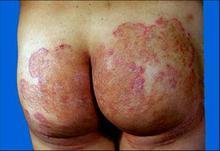 初于股上部内侧出现小片红斑,其上有脱屑,并逐渐扩展而向四周蔓延,边界清楚,其上 有丘疹、水疱、结痂。中央部位可自愈,有色素沉着或脱屑,历久则于局部皮肤发生浸润增厚呈苔藓化,常伴有痒感。严重者常扩展波及股内侧、会阴或肛门周围, 其下缘多甚清晰。有时尚可波及阴囊、阴茎根部等处。