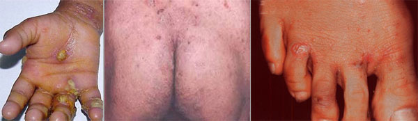 谚语云:“疥是一条龙,先从手缝行,围腰转三圈,阴部扎大营”, 这十分形象地描述了疥疮症状。“疥是一条龙”,说明了疥疮症状是泛发的,不是集中在某处,同时也说明了疥疮有延展性,常常痒无定处,如龙穿行;“先从手缝 行”,说明手缝是最先好发的部位;“围腰转三圈”,说明腰部常常是主要的发病部位;“阴部扎大营”,说明疥疮最后会在阴部出现疥疮结节。