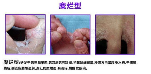 浸渍糜烂型脚气主要表现为第三和第四趾间,甚至可波及全趾间皮肤浸软,部分趾间皮肤皲裂,有时露出红色糜烂面,有臭味。可引起丹毒、癣菌病等合并症。皮疹夏重冬轻。此型足癣的致病菌尤喜在潮湿、温暖的环境里生长繁殖。因而当其长期寄生于伴有多汗的趾间时,易致表皮层皲裂,并因湿润浸渍而发白。趾间糜烂、角质层浸渍发白是本型特点。多见于足多汗或经常穿透气性差的雨鞋、胶鞋的人,角质贮水过多而浸渍发白。遭到破坏的角质层较松软,很容易刮除而露出红斑糜烂的基底面。