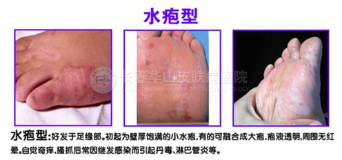 水疱型脚气的水疱或群或散分布于足跖、足缘。局部皮肤潮红,有时继发细菌感染时水疱脓疱,以夏季多见。本型常为急性发展期脚气,起病较急,夏重冬轻。原发损害以小水疱为主,成群或散发,壁厚。疱液清,常位于趾间、足心及足侧缘。水疱位于表皮角质层下,由于足跖部角质层较厚,水疱壁不易被穿破,周围皮肤无红晕。如果不继发细菌感染,数天后疱液可自行吸收。水疱破裂后形成环状脱屑,皮损继续向四周扩大。皮损不断向四周扩展蔓延时,部分小水疱可融合成大水疱。如果继发细菌感染,则疱周出现红晕,疱液化脓变浑浊。疱壁溃破后局部出现糜烂或肿胀。此时,如果用药不当炎症得不到及时控制,则容易引起淋巴管炎等一些并发症。