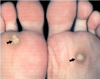它好发于足底、跖部、小趾外沿,趾背等易摩擦、挤压处,但不限于受压部位。多为1~2个,也可为多发。因角质栓尖端呈楔状嵌入角质层,其尖端压迫真皮层内的末梢神经,做站立或行走时会有剧痛。