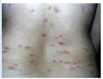 3、典型皮损为绿豆或稍大淡红色丘疹,性质坚硬,顶端常有小疱,搔破后结痂,周围有纺锤形红晕,经搔抓后呈现风团,风团消退后仍恢复原形。
