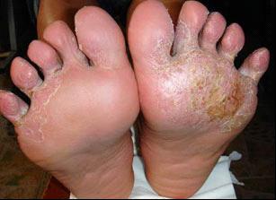 1、角化过度型常见于足根、足跖及其侧缘。角质层增厚、粗糙、脱屑、干燥。自觉症状轻微。每到冬季,易发生皲裂。本型常发生于病期较长、年龄较长患者。