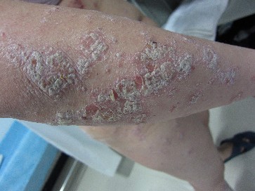 41岁的刘女士来我院治疗牛皮癣时,已有四年的病史。刘女士介绍,四年前,右上臂因被玻璃划破,造成感染,后伤口痊愈,但伤口处经常瘙痒发红,半月之后伤口周围出现红斑,红斑处干燥,逐步形成银白色皮屑,周围翘起,中部与皮肤相连,皮屑层层脱落,并慢慢向四周扩展,皮肤变硬,瘙痒难忍。病发一月后,去当地医院治疗,诊断为牛皮癣,用西药治疗,但毫无效果。癣块扩散到整个背部。