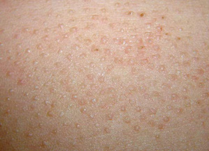 没想到,柳暗花明又一村,我突然想到在网上发贴子,我在网上发了这样一段话:有人用过维A酸乳膏治疗毛周角化症的吗?效果 怎么样?应该怎么用?快救救我吧!我快被这病折磨死了。这招效果真的不错,短短的几小时过去了,就有人给我回贴了:咱是一路人呢 。我用过那药啊,这药需要长期用且有副作用啊!真的,我以前坚持用,用完一支之后就好多了。后来没用就又复发了。大多数人的胳膊上会有一些小点点,似乎汗毛没有长出来。有的是密密麻麻一大片小红点点,有的则是少少的几粒而已,轻微的症状如果不在意, 也不知道自己是否患病,这就是毛周角化最常见的,首先它是一种遗传病,其次你不必把它看成一种病,你可以象看待络腮胡那样看它,不需要治疗。如果非常丑陋,你可以考虑每晚洗完澡涂抹维A酸软膏,商品名有迪维霜,但白天要洗掉,因为该药应避免涂抹在暴 露于紫中线的部位。这样比较麻烦,而且A酸软膏需要长期坚持使用,是药三分毒,用的时间长了会有副作用。